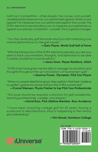 Golf has 3 competitors - other players, the course, and yourself. Leaderboards measure how you performed against others; score against Par measures how you performed against the course. The GYRA Mental Scorecard allows you to measure your performance against your primary competitor - yourself - per shot, per hole. This is a game-changer. "You may never play golf the same way if you start measuring your mental performance on the golf course." Gary Player, World Golf Hall of Fame "With the introduction of the GYRA Mental Scorecard, you are now able to track your emotions, thoughts, and behaviors to be able to better yourself for future situations." Jason Gore, Player Relations, USGA "GYRA tools have given me the skills to manage my emotions and thoughts throughout the up's and down's of tournament golf." Seamus Power, Olympian, PGA Tour Player "I have been coaching college golf for 20 years. The difference between a good vs great player is usually their mental approach to the game. The idea of having a scorecard for golfers to describe and track what is happening in their mind is groundbreaking." Tim Straub, Davidson College "This book should be required curriculum for golf academies, teaching professionals, caddies, and players." David Ross PGA Lifetime Member, Ross Academy