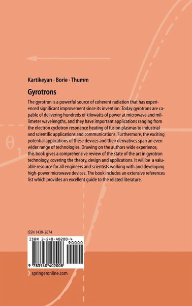 "This book is a rather comprehensive course on gyrotrons ... . The reader will appreciate the many tables and clear figures, discussions of accuracy, practical and technical considerations on conflicting requirements and on imperfections, and the 325 references. This generally well written and typeset volume is a good textbook to catch upwith current progress. It should find its way to the office of engineers and specialized scientists, as well as of Ph.D. students, teachers and researchers ... ." (Yves Elskens, Physicalia, Vol. 28 (4-6), 2006)