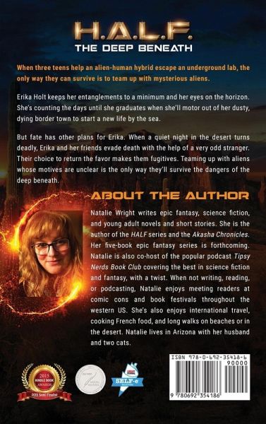 A Living Weapon. A Teen Fugitive. A Conspiracy that will Shake the Cosmos. Erika planned to keep life simple: fly under the radar, avoid trouble, and count the days until graduation-when she can finally escape her decaying border town for a new beginning. But fate has other plans. All bets are off when a night chilling with friends catapults Erika into danger... and a new destiny. When chaos erupts in the silent desert, Erika and her friends are forced to ally with a mysterious stranger whose very existence defies nature. Meet HALF Nine: Engineered to be the ultimate weapon, he defeats foes using only his mind. Held as a captive experiment, Nine has never known kindness or connection. His daring escape from an underground lab will lead him directly to Erika's unpredictable world. To escape shadowy forces, both Erika and Nine must learn to trust. When once-buries secrets surface, Erika and Nine must rely on their newfound friendship and raw courage to defy fate. H.A.L.F.: The Deep Beneath is a mesmerizing blend of mystery, high-octane action, and the untamed spirit of human resilience. Prepare to be swept away into a world where every choice could be your last, and where the true power of the heart proves mightier than any weapon. Accolades for H.A.L.F.: The Deep Beneath: Finalist in the 2015 Kindle Book Review Awards Silver Medal 2015, Wishing Shelf Book Awards Chosen by Library Journal for its Curated eBook Collection Silver Award 2015, Beach Book Festival Awards Literary Titan Gold Award Praise for HALF: The Deep Beneath: "With its themes of defiance, the quest for freedom, and the power of joining forces against dangers threatening humankind, the H.A.L.F. series is more relevant than ever." -J. FARLEY, REVIEWER "A fast-paced sci-fi adventure. Silver Medalist in the Wishing Shelf Awards and highly recommended." ~Wishing Shelf Reviews "The action is great, and the scene with the alien spaceship was crazy good. I found the ending to be quite surprising. It made me want to read the next one to see what happens both above ground and below. I recommend this to all fans of sci-fi adventures." ~CJ Anaya, Best Selling Author of The Healer Series