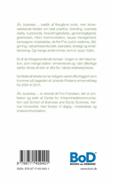 "Åh, business ..." er skrevet af Finn Frandsen, der er professor og leder af Center for Virksomhedskommunikation ved School of Business and Social Sciences, Aarhus Universitet. Han forsker til daglig i kriseledelse og krisekommunikation.
