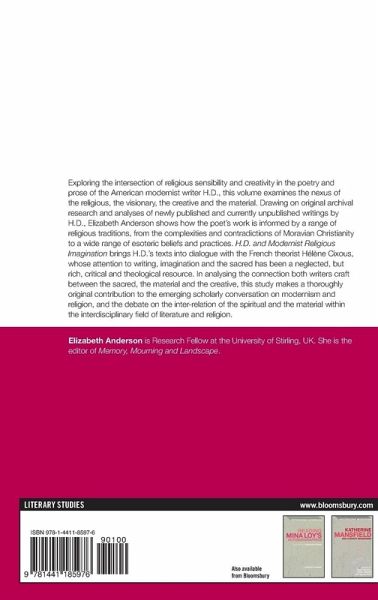 Exploring the intersection of religious sensibility and creativity in the poetry and prose of the American modernist writer, H.D., this volume explores the nexus of the religious, the visionary, the creative and the material. Drawing on original archival research and analyses of newly published and currently unpublished writings by H.D., Elizabeth Anderson shows how the poet's work is informed by a range of religious traditions, from the complexities and contradictions of Moravian Christianity to a wide range of esoteric beliefs and practices. H.D and Modernist Religious Imagination brings H.D.'s texts into dialogue with the French theorist Hélène Cixous, whose attention to writing, imagination and the sacred has been a neglected, but rich, critical and theological resource. In analysing the connection both writers craft between the sacred, the material and the creative, this study makes a thoroughly original contribution to the emerging scholarly conversation on modernism and religion, and the debate on the inter-relation of the spiritual and the material within the interdisciplinary field of literature and religion.