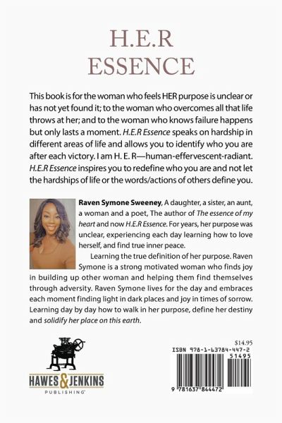 This book is for the woman who feels HER purpose is unclear or has not yet found it; to the woman who overcomes all that life throws at her; and to the woman who knows failure happens but only lasts a moment. HER Essence speaks on hardship in different areas of life and allows you to identify who you are after each victory. I am H. E. R--human-effervescent-radiant. HER Essence inspires you to redefine who you are and not let the hardships of life or the words/actions of others define you.
