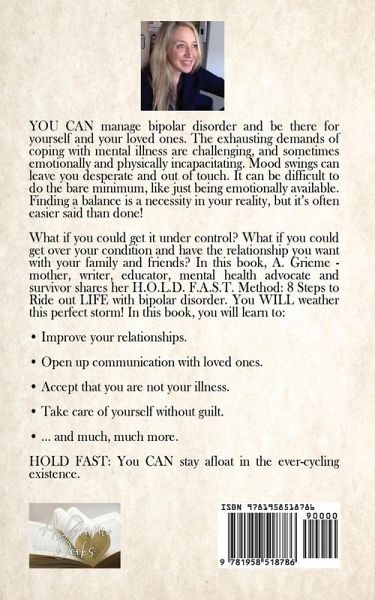 You CAN manage your bipolar disorder and be there for your family. The exhausting demands of life while coping with bipolar disorder are challenging, and sometimes emotionally and physically incapacitating. Mood swings can leave you desperate and out of touch with your family. It can be difficult to do the bare minimum like just being emotionally available when they need you. Finding a balance is a necessity in YOUR REALITY, but it's often easier said than done! What if you could get it under control? What if you could get over your condition and have the relationship you want with your family? In this book, A. Grieme, Mother, Educator, Author, Mental Health Advocate and Survivor shares her H.O.L.D F.A.S.T Method: 8 Steps to Ride out LIFE with bipolar disorder. You, TOO, can weather this perfect storm! A. Grieme will show you how to maneuver through life and family with bipolar disorder. In this book, you will learn to: Improve your relationship with your family, friends, and coworkers. Open up communication with loved ones. Enjoy each moment while you have it. Take care of yourself without guilt. ... and much, much more. H.O.L.D. F.A.S.T. - You CAN stay afloat in the ever-cycling existence of life with bipolar disorder.