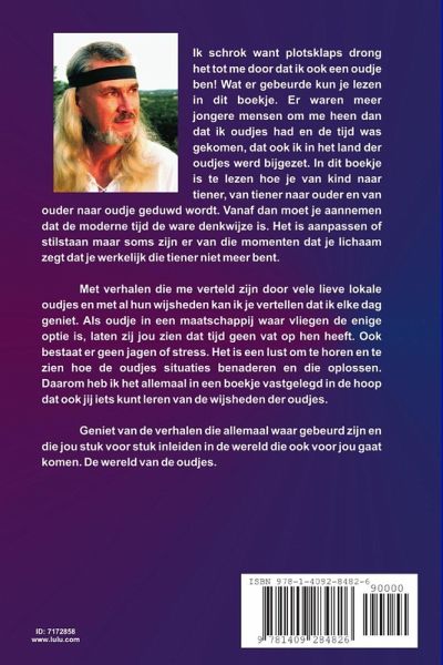 Ik schrok want plotsklaps drong het tot me door dat ik ook een oudje ben! Wat er gebeurde kun je lezen in dit boekje. Er waren meer jongere mensen om me heen dan dat ik oudjes had en de tijd was gekomen, dat ook ik in het land der oudjes werd bijgezet. In dit boekje is te lezen hoe je van kind naar tiener, van tiener naar ouder en van ouder naar oudje geduwd wordt. Vanaf dan moet je aannemen dat de moderne tijd de ware denkwijze is. Het is aanpassen of stilstaan maar soms zijn er van die momenten dat je lichaam zegt dat je werkelijk die tiener niet meer bent. Met verhalen die me verteld zijn door vele lieve lokale oudjes en met al hun wijsheden kan ik je vertellen dat ik elke dag geniet. Als oudje in een maatschappij waar vliegen de enige optie is, laten zij jou zien dat tijd geen vat op hen heeft. Ook bestaat er geen jagen of stress. Het is een lust om te horen en te zien hoe de oudjes situaties benaderen en die oplossen.