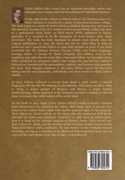 An extremely funny book about an underemployed bank clerk by Edwin Lefèvre. Edwin Lefèvre (1871-1943) was an American journalist, writer, and diplomat, who is most noted for his writings on Wall Street business. Of the eight books written by Edwin Lefèvre, his Reminiscences of a Stock Operator is considered a classic of American business writing. The book began as a series of twelve articles published during 1922 and 1923 in The Saturday Evening Post. It is written as first-person fiction, telling the story of a professional stock trader on Wall Street. While published as fiction, generally, it is accepted to be the biography of stock market whiz, Jesse Livermore. The book has been reprinted in almost every decade since its original publication in 1925, the latest put out by John Wiley & Sons in hardcover and a paperback edition in 1994 that remains in print. It has been translated into the Chinese, German, French, Polish, and Italian languages, amongst others. A George H. Doran Company first edition, even in fair condition, may sell today for more than a thousand dollars. In December 2009, Wiley published an annotated edition that bridges the gap between Lefèvre's fictionalized account and the personalities, exploits, and locations that populate the book. Page margins notations in the 2009 edition explain the historical setting and the real companies, individuals, and news events to which Lefèvre alludes. In 1925, Lefèvre authored a second book about a stock trader, a factual biography with the title The Making of a Stockbroker. This book was about John K. Wing, a senior partner of Bronson and Barnes, a major Boston stockbrokerage, whose approach to the business provided a contrast to that of Jesse Livermore, the veiled subject of his earlier book. On his death in 1943 (aged 71-72), Edwin Lefèvre's estate in Dorset, Vermont (near Manchester) was passed to his widow. Built about 1820, it was the first home in the United States made with marble quarried right on the property. Their eldest son, Edwin Lefèvre, Jr. (b. 1902), who also worked on Wall Street, inherited the home and completely restored it in 1968 when he retired there. Now it is listed on the National Register of Historic Places. Their second son, Reid Lefèvre (b. 1904), was the founder of the traveling carnival known as the "King Reid Show" and a politician. He was elected to the Vermont General Assembly, serving as a member of the House of Representatives from 1947 to 1959 and the state Senate from 1961 to 1963. (wikipedia.org)