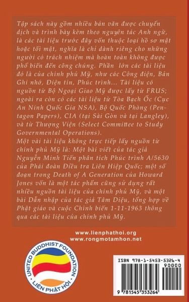 T¿p sách này g¿m nhi¿u b¿n v¿n ¿¿¿c chuy¿n d¿ch và trình bày kèm theo nguyên tác Anh ng¿, là các tài li¿u tr¿¿c ¿ây v¿n thüc löi h¿ s¿ m¿t höc t¿i m¿t, ngh¿a là ch¿ dành riêng cho nh¿ng ng¿¿i có trách nhi¿m mà hoàn toàn không ¿¿¿c ph¿ bi¿n ¿¿n công chúng. Ph¿n l¿n các tài li¿u ¿ó là c¿a chính ph¿ M¿, nh¿ các Công ¿i¿n, B¿n Ghi nh¿, ¿i¿n tín, Phúc trình... Tài li¿u có ngün t¿ B¿ Ngöi Giao M¿ ¿¿¿c l¿y t¿ FRUS; ngoài ra còn có các tài li¿u t¿ Tòa B¿ch ¿c (C¿c An Ninh Qüc Gia NSA), B¿ Qüc Phòng (Pentagon Papers), CIA (t¿i Sài Gòn và t¿i Langley), và t¿ Th¿¿ng Vi¿n (Select Committee to Study Governmental Operations). M¿t vài tài li¿u không tr¿c ti¿p l¿y ngün t¿ chính ph¿ M¿ là: M¿t bài vi¿t c¿a tác gi¿ Nguy¿n Minh Ti¿n phân tích Phúc trình A/5630 c¿a Phái ¿oàn ¿i¿u tra Liên Hi¿p Qüc; m¿t s¿ ¿ön trong Death of A Generation c¿a Howard Jones v¿n là m¿t tác ph¿m c¿ng s¿ d¿ng r¿t nhi¿u ngün tài li¿u c¿a chính ph¿ M¿, và m¿t bài D¿n nh¿p c¿a tác gi¿ Tâm Di¿u, t¿ng h¿p v¿ Ph¿t giáo và cüc Chính bi¿n 1-11-1963 thông qua các tài li¿u c¿a chính ph¿ M¿.