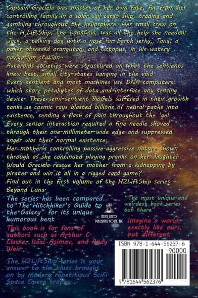 H2LiftShips- Beyond Luna Captain Graciela was master of her own fate, far from her controlling family in a solar sail cargo ship, trading and gambling throughout the heliosphere. Her small crew on the H2LiftShip, the LunaCola, was all the help she needed: Jack, a talking dog with a nose for Earth jerky, Tang, a poker obsessed orangutang, and Octopus, in his watery navigation station. Strong, finely woven nano-spider cloth, filled with hydrogen, haul H2LiftShips to the edge of Earth before being transformed into kilometers-wide solar sails. The same fabric, on return, is a parasail, flying the ship to the aerodrome in the desert. Commerce is the name of the game in this saga and everything has a value. Heat generated from the collection of molecules and garbage surrounding the planet is captured in radiators and sold to the planetary electric grid as a bonus for the crew. The crew was anxious for some 'me' time after being in the void for too long. Tang was ready to double his money in Las Vegas, Octopus planned a coastal shopping trip for live fish, clams, and eggs. Finally, Graciela and Jack were on an epic road trip looking for cargo for the asteroid mines. It wasn't all fun and games for the vast population inhabiting the heliosphere. Asteroids societies were structured on what the sentients knew best, small city-states hanging in the void. Ponos is an injured miner and has to fall back to gig work as he recovers. He was lucky to make enough to cover food and waste handling on the jobs he could find. Find out how he connects with his old pirate captain and makes a break from the daily grind of a workologists on a cold, isolated rock. Lead had more value than gold and was hard to find in the asteroids. Mushrooms, infused with lead, protected all living-chambers, lightly glowing as cosmic rays bounce around the mycelium, changing states for all concerned. Every sentient and most machines use DNA-computers, which store petabytes of data and interface any sensing device. These semi-sentient bioGels suffered in their growth tanks as cosmic rays blasted billions of neural paths into existence, sending a flash of pain throughout the gel. It was no better after leaving their growing chambers and being sold in the wider heliosphere. Every sensor interaction required a fine needle shoved through their one-millimeter-wide edge and suppressed anger was their normal existence. There were no avoiding family issues as Graciela met her mother on some distant rock. Her mother's controlling passive-aggressive nature shown through as she continued playing pranks on her daughter Would Graciela rescue her mother from a kidnapping by pirates and win it all in a rigged card game? Find out in the first volume of the H2LiftShip series - Beyond Luna.