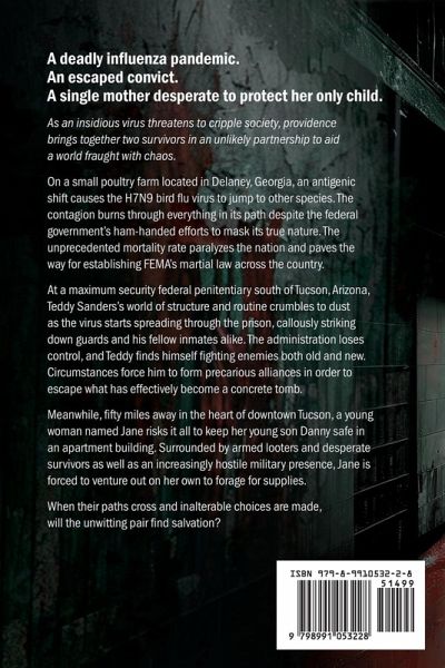 As a deadly virus cripples society, fate intertwines the lives of two survivors, forging an unlikely alliance in a world engulfed by chaos. In Delaney, Georgia, an antigenic shift in the H7N9 bird flu virus triggers a catastrophic outbreak, jumping from birds to humans with devastating effects. Despite the federal government's attempts to downplay the severity, the contagion ravages communities, leading to an unprecedented death toll and the swift imposition of martial law. At a maximum-security federal penitentiary south of Tucson, Arizona, Teddy Sanders watches the structured world around him crumble as the virus breaches the prison walls, indiscriminately claiming the lives of guards and inmates. Overwhelmed by chaos, Teddy navigates a maze of threats and alliances to escape his concrete tomb. Just fifty miles away, Jane fights to keep her son safe in a rapidly deteriorating Tucson, battling looters and an increasingly oppressive military presence. Her desperate search for supplies becomes a daily struggle for survival. As their paths intersect, Teddy and Jane must make pivotal choices that will shape their futures. Can they find hope and salvation in a world falling apart?