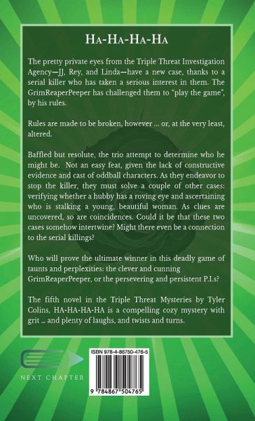 The pretty private eyes from the Triple Threat Investigation Agency-JJ, Rey, and Linda-have a new case, thanks to a serial killer who has taken a serious interest in them. The GrimReaperPeeper has challenged them to "play the game", by his rules. Rules are made to be broken, however ... or, at the very least, altered. Baffled but resolute, the trio attempt to determine who he might be. Not an easy feat, given the lack of constructive evidence and cast of oddball characters. As they endeavor to stop the killer, they must solve a couple of other cases: verifying whether a hubby has a roving eye and ascertaining who is stalking a young, beautiful woman. As clues are uncovered, so are coincidences. Could it be that these two cases somehow intertwine? Might there even be a connection to the serial killings? Who will prove the ultimate winner in this deadly game of taunts and perplexities: the clever and cunning GrimReaperPeeper, or the persevering and persistent P.I.s? The fifth novel in the Triple Threat Mysteries by Tyler Colins, HA-HA-HA-HA is a compelling cozy mystery with grit ... and plenty of laughs, and twists and turns.