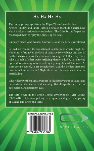 The pretty private eyes from the Triple Threat Investigation Agency-JJ, Rey, and Linda-have a new case, thanks to a serial killer who has taken a serious interest in them. The GrimReaperPeeper has challenged them to "play the game", by his rules. Rules are made to be broken, however ... or, at the very least, altered. Baffled but resolute, the trio attempt to determine who he might be. Not an easy feat, given the lack of constructive evidence and cast of oddball characters. As they endeavor to stop the killer, they must solve a couple of other cases: verifying whether a hubby has a roving eye and ascertaining who is stalking a young, beautiful woman. As clues are uncovered, so are coincidences. Could it be that these two cases somehow intertwine? Might there even be a connection to the serial killings? Who will prove the ultimate winner in this deadly game of taunts and perplexities: the clever and cunning GrimReaperPeeper, or the persevering and persistent P.I.s? The fifth novel in the Triple Threat Mysteries by Tyler Colins, HA-HA-HA-HA is a compelling cozy mystery with grit ... and plenty of laughs, and twists and turns.