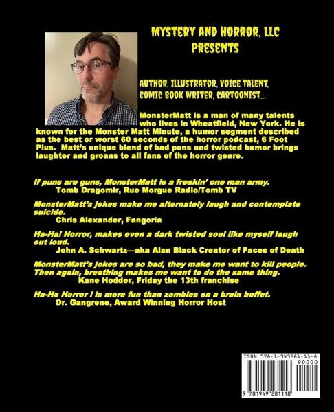 Monstermatt is the author of many horrible jokes and puns drawn from his encyclopedic knowledge of horror films. Ha!-Ha! Horror was born out of the best and worst of the horror genre. This collector's edition is the ultimate guide to his twisted sense of humor complete with dozens of his drawings and over twenty-seven hundred bad jokes. There is a stomach-churning number of bad puns that will make you groan, and laugh, and wonder how anyone could know this much about horror. If you love listening to his "Monster Minute" on Six Foot Plus, you will love this book. The book will delight his fans but be warned, his humor is not for those who love good comedy. His jokes will bring tears to your eyes. The uninitiated might want to take them in small doses until they build up a tolerance to the world's worst puns.