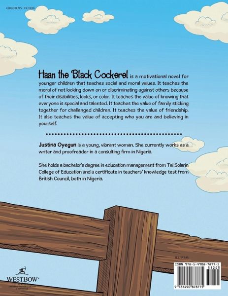 Haan the Black Cockerel is a motivational novel for younger children that teaches social and moral values. It teaches the moral of not looking down on or discriminating against others because of their disabilities, looks, or color. It teaches the value of knowing that everyone is special and talented. It teaches the value of family sticking together for challenged children. It teaches the value of friendship. It also teaches the value of accepting who you are and believing in yourself.