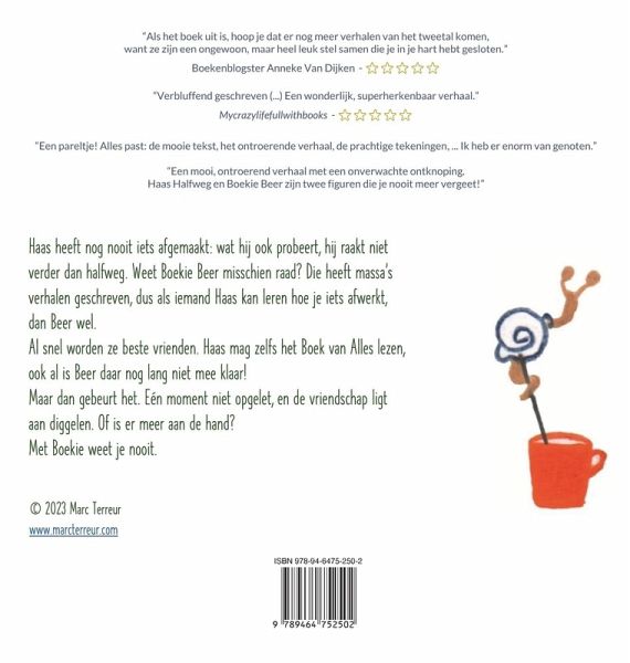 Haas heeft nog nooit iets afgemaakt: wat hij ook probeert, hij raakt niet verder dan halfweg. Weet Boekie Beer misschien raad? Die heeft massa's verhalen geschreven, dus als iemand Haas kan leren hoe je iets afwerkt, dan Beer wel. Al snel worden ze beste vrienden. Haas mag zelfs het Boek van Alles lezen, ook al is Beer daar nog lang niet mee klaar! Maar dan gebeurt het. Eén moment niet opgelet, en de vriendschap ligt aan diggelen. Of is er meer aan de hand? Met Boekie weet je nooit. Dit juweeltje werd met ¿¿¿¿¿ beloond door boekenblogster Anneke Van Dijken:¿¿¿¿ ¿¿"Als het boek uit is, hoop je dat er nog meer verhalen van het tweetal komen, want ze zijn een ongewoon, maar heel leuk stel samen die je in je hart hebt gesloten." Ook ¿¿¿¿¿ van mycrazylifefullwithbooks (Kathleen Van Lierop): ¿¿¿¿"Verbluffend geschreven (...) Een prachtig, superherkenbaar verhaal" Quotes van lezers van het e-boek: "Een pareltje! Alles past: de mooie tekst, het ontroerende verhaal, de prachtige tekeningen, ... Ik heb er enorm van genoten." "De kleinkinderen en ikzelf hebben hier heel erg van genoten. Een mooi, ontroerend verhaal met een onverwachte ontknoping. Haas Halfweg en Boekie Beer zijn twee figuren die je nooit meer vergeet!"