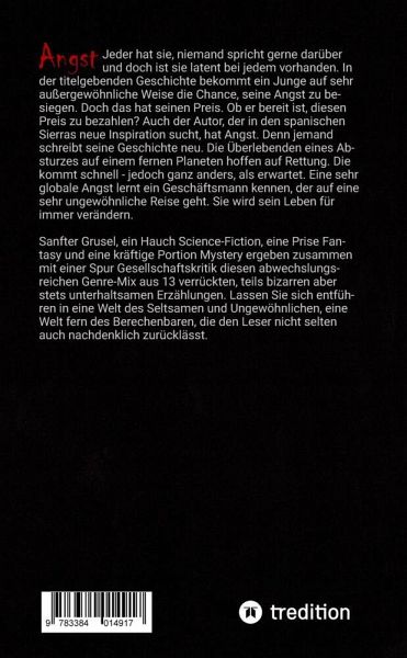 Angst! Jeder hat sie, niemand spricht gerne darüber und doch ist sie latent bei jedem vorhanden. In der titelgebenden Geschichte bekommt ein Junge auf sehr außergewöhnliche Weise die Chance, seine Angst zu besiegen. Doch das hat seinen Preis. Ob er bereit ist, diesen Preis zu bezahlen? Auch der Autor, der in den spanischen Sierras neue Inspiration sucht, hat Angst. Denn jemand schreibt seine Geschichte neu. Die Überlebenden eines Absturzes auf einem fernen Planeten hoffen auf Rettung. Die kommt schnell - jedoch ganz anders, als erwartet. Eine sehr globale Angst lernt ein Geschäftsmann kennen, der auf eine sehr ungewöhnliche Reise geht. Sie wird sein Leben für immer verändern.Sanfter Grusel, ein Hauch Science-Fiction, eine Prise Fantasy und eine kräftige Portion Mystery ergeben zusammen mit einer Spur Gesellschaftskritik diesen abwechslungsreichen Genre-Mix aus 13 verrückten, teils bizarren aber stets unterhaltsamen Erzählungen. Lassen Sie sich entführen in eine Welt des Seltsamenund Ungewöhnlichen, eine Welt fern des Berechenbaren, die den Leser nicht selten auch nachdenklich zurücklässt.