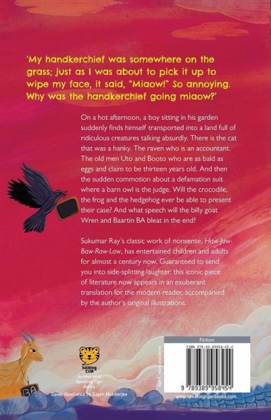 Description On a hot afternoon, a boy sitting in his garden suddenly finds himself transported into a land full of ridiculous creatures talking absurdly. There is the cat that was a hanky. The raven who is an accountant. The old men Uto and Booto who are as bald as eggs and claim to be thirteen years old. And then the sudden commotion about a defamation suit where a barn owl is the judge. Will the crocodile, the frog and the hedgehog ever be able to present their case? And what speech will the billy goat Wren and Baartin BA bleat in the end? Sukumar Ray's classic work of nonsense, Haw-Jaw-Baw-Raw-Law, has entertained children and adults for almost a century now. Guaranteed to send you into side-splitting laughter, this iconic piece of literature now appears in an exuberant translation for the modern reader, accompanied by the author's original illustrations.
