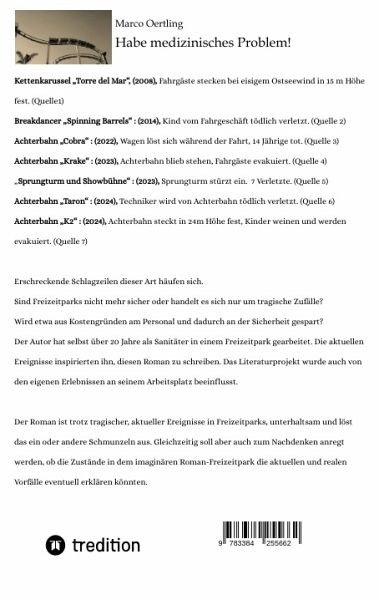 Im Roman erzählt der fiktive Betriebssanitäter "Manno Jakkatatsch" von seinen Erlebnissen in einem Freizeitpark. Erzählt wird von medizinischen Notfallversorgungen und den typischen Verletzungen und Erkrankungen in der sehr speziellen Freizeitpark-Atmosphäre. Durch explizites Beschreiben ungewöhnlicher Begleitumstände bei den Notfalleinsätzen, insbesondere den teils grotesken Verhaltensweisen der Patienten, sind die Geschichten sehr unterhaltsam. Außerdem werden die Funktionen sowie die Schwachstellen einzelner Fahrattraktionen und daraus resultierender Unfallgefahren detailliert erklärt.…mehr