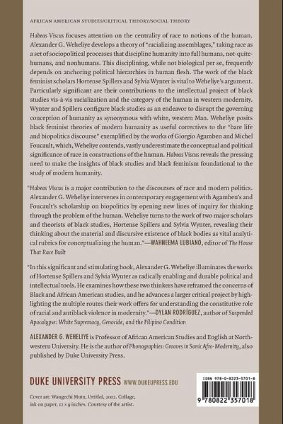 Habeas Viscus focuses attention on the centrality of race to notions of the human. Alexander G. Weheliye develops a theory of "racializing assemblages," taking race as a set of sociopolitical processes that discipline humanity into full humans, not-quite-humans, and nonhumans. This disciplining, while not biological per se, frequently depends on anchoring political hierarchies in human flesh. The work of the black feminist scholars Hortense Spillers and Sylvia Wynter is vital to Weheliye's argument. Particularly significant are their contributions to the intellectual project of black studies vis-à-vis racialization and the category of the human in western modernity. Wynter and Spillers configure black studies as an endeavor to disrupt the governing conception of humanity as synonymous with white, western man. Weheliye posits black feminist theories of modern humanity as useful correctives to the "bare life and biopolitics discourse" exemplified by the works of Giorgio Agamben and Michel Foucault, which, Weheliye contends, vastly underestimate the conceptual and political significance of race in constructions of the human. Habeas Viscus reveals the pressing need to make the insights of black studies and black feminism foundational to the study of modern humanity.