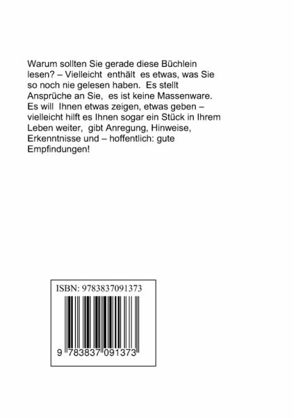 Warum sollten Sie gerade diese Büchlein lesen? - Vielleicht enthält es etwas, was Sie so noch nie gelesen haben. Es stellt Ansprüche an Sie, es ist keine Massenware. Es will Ihnen etwas zeigen, etwas geben - vielleicht hilft es Ihnen sogar ein Stück in Ihrem Leben weiter, gibt Anregung, Hinweise, Erkenntnisse und hoffentlich: gute Empfindungen!