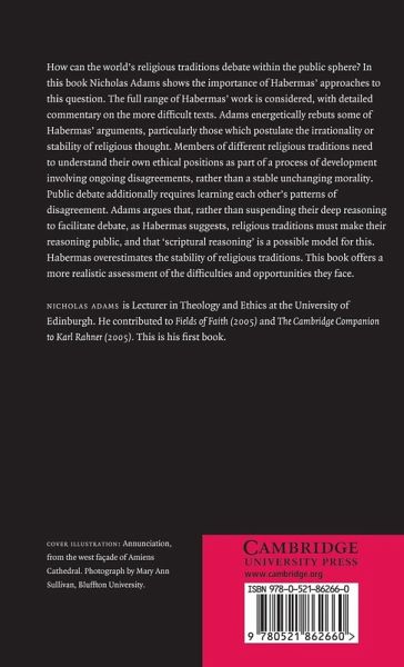 How can the world's religious traditions debate within the public sphere? In this book, Nicholas Adams shows the importance of Habermas' approaches to this question. The full range of Habermas' work is considered, with detailed commentary on the more difficult texts. Adams energetically rebuts some of Habermas' arguments, particularly those which postulate the irrationality or stability of religious thought. Members of different religious traditions need to understand their own ethical positions as part of a process of development involving ongoing disagreements, rather than a stable unchanging morality. Public debate additionally requires learning each other's patterns of disagreement. Adams argues that rather than suspending their deep reasoning to facilitate debate, as Habermas suggests, religious traditions must make their reasoning public, and that 'scriptural reasoning' is a possible model for this. Habermas overestimates the stability of religious traditions. This book offers a more realistic assessment of the difficulties and opportunities they face.