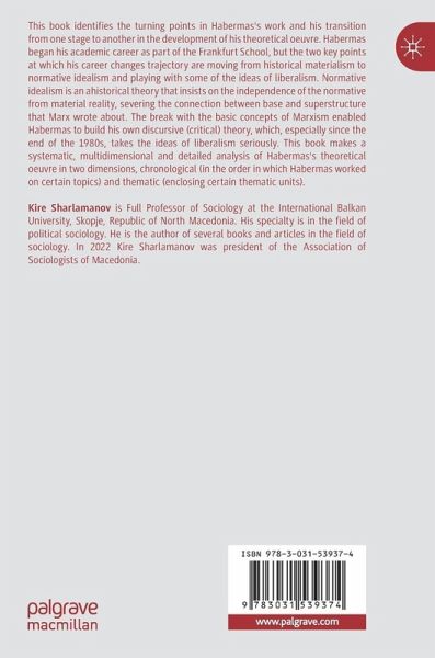 This book identifies the turning points in Habermas's work and his transition from one stage to another in the development of his theoretical oeuvre. Habermas began his academic career as part of the Frankfurt School, but the two key points at which his career changes trajectory are moving from historical materialism to normative idealism and playing with some of the ideas of liberalism. Normative idealism is an ahistorical theory that insists on the independence of the normative from material reality, severing the connection between base and superstructure that Marx wrote about. The break with the basic concepts of Marxism enabled Habermas to build his own discursive (critical) theory, which, especially since the end of the 1980s, takes the ideas of liberalism seriously. This book makes a systematic, multidimensional and detailed analysis of Habermas's theoretical oeuvre in two dimensions, chronological (in the order in which Habermas worked on certain topics) and thematic (enclosingcertain thematic units).