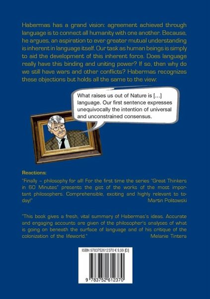 Habermas's great philosophical discovery is a rousing and a modest one. Rousing because almost two centuries after the great philosophers of history Hegel and Marx he attempts once again to discover a meaning and purpose for human history; modest because he describes without bombast humanity's ability to shape its own future and deduces this ability from a phenomenon we encounter in our daily life: language. It is no longer, as in Hegel, the World-Spirit nor, as in Marx, class struggle that forms the motor of development but rather human speech. Agreement achieved through language will, says Habermas, eventually unite humanity.The wish for such an ever greater agreement, based on an unforced exchange of views, is inherent in the structure of our speech. Because as soon as anyone speaks with anyone else anywhere on earth, he must, consciously or unconsciously, raise four universal validity-claims, such as the claim to be understood. What begins so simply is developed by Habermas in an hypothesis of great breadth. In communicative action, and thus in language, there inheres a stubborn claim to rationality, even if it is constantly suppressed.Does language really compel us to rationality? Does it really have such emancipatory power or is it, in the end, just a tool? And if language really causes humanity to draw closer together, why are there still wars? Habermas answers all these questions. The book "Habermas in 60 Minutes" explains the core of his philosophy using over 60 key quotations and many examples. The chapter "Of What Use is Habermas's Discovery to Us Today?" points up the meaning of his Critical Theory for our present world and for our personal lives. The book appears as part of the popular series "Great Thinkers in 60 Minutes".