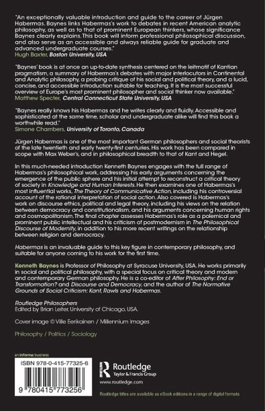 1. Life and Works 2. Habermas's Initial Attempts at a Critical Theory of Society 3. The Theory of Communicative Action: Habermas's Model of a Critical Social Science 4. Habermas's "Kantian Pragmatism" 5. Locating Discourse Morality 6. Democracy and the Rechtsstaat: Habermas's Between Facts and Norms 7. Deliberative Democracy, Public Reason, and Democracy Beyond the Nation-State 8. A "sobered" philosophy: Postmodernism, Postmetaphysical Thinking, and Postsecularism 9. Conclusion. Index