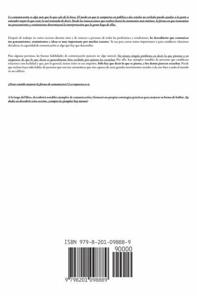 La comunicación es algo más que lo que sale de la boca. El modo en que te comportas en público y das señales no verbales puede ayudar a la gente a entender mejor lo que estás (o no) tratando de decir. Desde las transacciones que realices hasta los momentos más íntimos, la forma en que transmitas tus pensamientos y sentimientos determinará la interpretación que la gente haga de ellos. Después de trabajar en varios sectores durante años y de conocer a personas de todas las profesiones y condiciones, he descubierto que comunicar tus pensamientos, sentimientos e ideas es muy importante por muchas razones. Ya sea para cerrar tratos importantes o para establecer relaciones duraderas, la capacidad de comunicación es algo que hay que desarrollar. Para algunas personas, las buenas habilidades de comunicación parecen ser algo natural. No tienen ningún problema en decir lo que piensan y en asegurarse de que lo que dicen es generalmente bien recibido por quienes les escuchan. Por ello, hay ejemplos notables de personas que establecen relaciones con facilidad y que, por lo general, tienen éxito en sus empeños. Sólo hay que decir lo que se piensa, y los demás parecen escuchar. Puede que incluso haya oído hablar de personas que son tan carismáticas que son capaces de crear grandes movimientos sociales o de caer bien a todo el mundo en un edificio. ¿Tiene sentido mejorar la forma de comunicarse? La respuesta es sí. A lo largo del libro, descubrirá notables ejemplos de comunicación y formará sus propias estrategias prácticas para mejorar su forma de hablar. No dudes en descubrir estos secretos, ¡compra tu ejemplar hoy mismo!