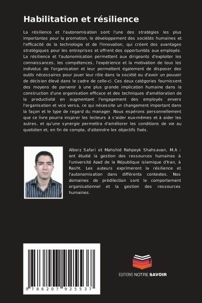La résilience et l'autonomisation sont l'une des stratégies les plus importantes pour la promotion, le développement des sociétés humaines et l'efficacité de la technologie et de l'innovation, qui créent des avantages stratégiques pour les entreprises et offrent des opportunités aux employés. La résilience et l'autonomisation permettent aux dirigeants d'exploiter les connaissances, les compétences, l'expérience et la motivation de tous les individus de l'organisation et leur permettent également de disposer des outils nécessaires pour jouer leur rôle dans la société ou d'avoir un pouvoir de décision élevé dans le cadre de celle-ci. Ces deux catégories fournissent des moyens de parvenir à une plus grande implication humaine dans la construction d'une organisation efficace et des techniques d'amélioration de la productivité en augmentant l'engagement des employés envers l'organisation et vice versa, ce qui nécessite un changement important dans la façon et le type de regard du manager. Nous espérons personnellement que ce livre pourra inspirer les lecteurs à s'aider eux-mêmes et à aider les autres, et qu'une synergie permettra d'améliorer les conditions de vie au quotidien et, en fin de compte, d'atteindre les objectifs fixés.