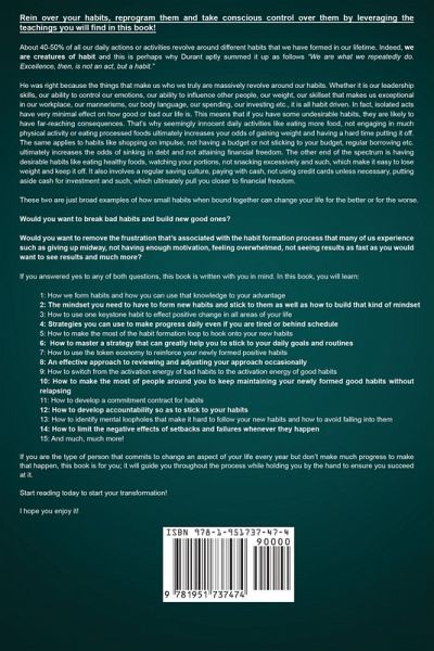 Do you want to be among the few that swear by the habit formation process after seeing it transform your life? This book is meant for you! 40-50% of all our daily actions or activities revolve around different habits that we have formed in our lifetime. Indeed, we are creatures of habit and this is perhaps why Durant aptly summed it up as follows "We are what we repeatedly do. Excellence, then, is not an act, but a habit." He was right because the things that make us who we truly are massively revolve around our habits. So if you want to get ahead in life, you MUST build habits that move you close to your goals and break those that move you away from your goals. Let me ask you some 2 questions: * Would you want to break bad habits and build new good ones? * Would you want to remove the frustration that’s associated with the habit formation process? If you answered yes to any or both questions, this book is written with you in mind.