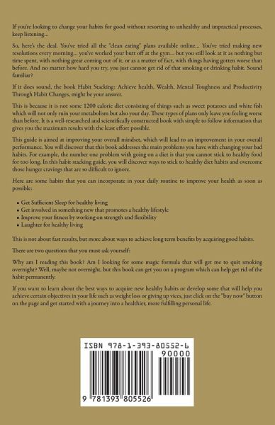 If you're looking to change your habits for good without resorting to unhealthy and impractical processes, keep listening… So, here's the deal. You've tried all the "clean eating" plans available online… You've tried making new resolutions every morning… you've worked your butt off at the gym… but you still look at it as nothing but time spent, with nothing great coming out of it, or as a matter of fact, with things having gotten worse than before. And no matter how hard you try, you just cannot get rid of that smoking or drinking habit. Sound familiar? If it does sound, the book Habit Stacking: Achieve health, Wealth, Mental Toughness and Productivity Through Habit Changes, might be your answer. This is because it is not some 1200 calorie diet consisting of things such as sweet potatoes and white fish which will not only ruin your metabolism but also your day. These types of plans only leave you feeling worse than before. It is a well-researched and scientifically constructed book with simple to follow information that gives you the maximum results with the least effort possible. This guide is aimed at improving your overall mindset, which will lead to an improvement in your overall performance. You will discover that this book addresses the main problems you have with changing your bad habits. For example, the number one problem with going on a diet is that you cannot stick to healthy food for too long. In this habit stacking guide, you will discover ways to stick to healthy diet habits and overcome those hunger cravings that are so difficult to ignore. Here are some habits that you can incorporate in your daily routine to improve your health as soon as possible:Get Sufficient Sleep for healthy living Get involved in something new that promotes a healthy lifestyle Improve your fitness by working on strength and flexibility Laughter for healthy living This is not about fast results, but more about ways to achieve long term benefits by acquiring good habits. There are two questions that you must ask yourself: Why am I reading this book? Am I looking for some magic formula that will get me to quit smoking overnight? Well, maybe not overnight, but this book can get you on a program which can help get rid of the habit permanently. If you want to learn about the best ways to acquire new healthy habits or develop some that will help you achieve certain objectives in your life such as weight loss or giving up vices, just click on the "buy now" button on the page and get started with a journey into a healthier, more fulfilling personal life.