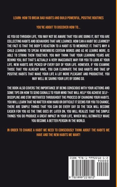LEARN: How to Break Bad Habits and Build Powerful, Positive Routines You’re about to discover how to... As you go through life, you may not be aware that you are doing it, but you are collecting habits and behaviors that are learned. How can a habit be learned? The fact is that the body’s reaction to a habit is to memorize it. That’s why a child learning to speak remembers certain words and as he learns more, is able to string them together. You may think that your learning years are behind you, but that’s actually a very inaccurate way for you to look at your life. New habits are picked up every day of your life. However, if you examine those that you already have, you can eliminate the bad habits and take up positive habits that make your life a lot more pleasant and productive. You may well be saving your life by doing so. The book also covers the importance of being conscious with your actions and some tips on how to send signals to your mind that will help you achieve self-discipline and stay motivated throughout the process of changing your habits. You will learn that no matter how hard or difficult it seems for you to change, there are simple things that you can do every day so the task will become easier for you as the time goes by. Later on, you will realize that the simple things you do produce a great impact in your life, which will ultimately make you become a better person in the world. In order to change a habit we need to consciously think about the habits we have and the new habits we want! Download your copy today!
