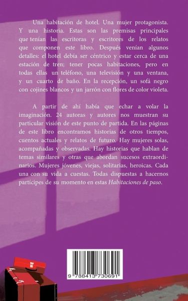 Una habitación de hotel. Una mujer protagonista. Y una historia. Esas son las premisas principales que tenían las escritoras y escritores de los 24 relatos que componen este libro. Después venían algunos detalles: el hotel debía ser céntrico y estar cerca de una estación de tren; tener pocas habitaciones, pero en todas ellas un teléfono, una televisión y una ventana, y un cuarto de baño. En la recepción, un sofá negro con cojines blancos y un jarrón con flores de color violeta. Con motivo de la celebración del Día Internacional de la Mujer, qué mejor que una antología de relatos en torno a mujeres de ayer, de hoy y de mañana.