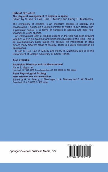 One Patterns.- 1 Habitat structure: the evolution and diversification of a complex topic.- 1.1 'Habitat structure' in ecology.- 1.2 A graphical model of 'habitat structure'.- 2 Development of habitat structure through succession in an Amazonian floodplain forest.- 2.1 Riparian primary succession in upper Amazonia: an overview.- 2.2 Methods.- 2.3 Results.- 2.4 Discussion.- 2.5 Conclusions.- 3 Habitat diversity and the species-area relationship: alternative models and tests.- 3.1 Alternative models of the species-area relationship.- 3.2 Protocols for the separation of causal mechanisms.- 3.3 Conclusions.- 4 Fractal geometry of ecological habitats.- 4.1 The geometry of simple fractals.- 4.2 Self-similarity and ways of estimating fractal dimensions.- 4.3 Ecological consequences of fractals.- 4.4 Size distributions.- 4.5 Range distributions.- 4.6 Abundance distributions.- 4.7 The reddened spectrum.- 4.8 Conclusions.- 5 The effect of habitat structure on the spatial distribution of freshwater invertebrate populations.- 5.1 Zooplankton.- 5.2 Profundal benthos.- 5.3 Littoral benthic invertebrates.- 5.4 Unionid mussels in the sandy littoral zone.- 5.5 Conclusions.- Two Responses: colonization, succession, resource use.- 6 Habitat structure and morphological patterns in arboreal vertebrates.- 6.1 Habitat structure and locomotion.- 6.2 Locomotion and morphology.- 6.3 Conclusions.- 7 Microtopography as habitat structure for mosses on rocks.- 7.1 The advantage of simplicity.- 7.2 Scheme for functional analysis.- 7.3 Quantifying habitat structure.- 7.4 Correlating habitat structure and community structure.- 7.5 Correlation of habitat structure and resource availability.- 7.6 The functional link between habitat and community structure.- 7.7 Conclusions.- 8 The effects of changes in habitat structure during succession in terrestrial communities.- 8.1 Changes in habitat structure during succession.- 8.2 Effects of changing habitat structure on associated organisms.- 8.3 Conclusions.- 9 Influence of patch size, vegetation texture, and host plant architecture on the diversity, abundance, and life history styles of sap-feeding herbivores.- 9.1 Responses of insect herbivores to vegetation texture and architectural complexity: an overview.- 9.2 Species-area relationships for sap-feeders.- 9.3 Sap-feeder abundance and patch size.- 9.4 Abundance-area relationships explained by life-history characteristics.- 9.5 Host plant density and vegetation diversity.- 9.6 Architectural complexity and sap-feeder richness.- 9.7 Architectural complexity, habitat persistence and sap-feeder life histories.- 9.8 Other considerations.- 9.9 Conclusions.- 10 Habitat structure and recruitment in coral reef fishes.- 10.1 Segregation of fish species among habitats.- 10.2 Recruitment of reef fishes.- 10.3 Habitat responses at settlement.- 10.4 Variability in recruitment.- 10.5 Habitat structure and the structure of reef fish assemblages.- 10.6 Conclusions.- 11 Habitat structure and community dynamics in marine benthic systems.- 11.1 Examples from marine benthic systems.- 11.2 Processes connecting habitat structure and community dynamics.- Three Responses: predation, parasitism, disturbance.- 12 The influence of fire periodicity on habitat structure.- 12.1 The ecology of fire.- 12.2 Effects of fire on habitat heterogeneity and plant structure.- 12.3 Post-fire habitat structure and mechanisms of regeneration.- 12.4 Post-fire animal responses to vegetation structure.- 12.5 Case studies.- 12.6 Conclusions.- 13 A new look at habitat structure: consequences of herbivore-modified plant architecture.- 13.1 How herbivores influence plant architecture.- 13.2 Consequences for plants of architecture modified as a result of herbivory.- 13.3 Consequences for herbivores of architecture modified as a result of herbivory.- 13.4 Herbivore-modified architecture and the evolution of plant form.- 13.5 Conclusions.- 14 Habitat structure and predator-prey interactions in vegetated aquatic syste...