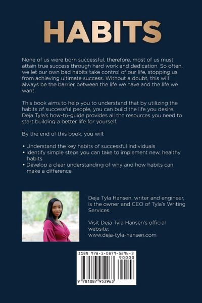 "Success is the sum of small efforts repeated day in and day out." -Robert Collier Have you ever faced the distress of doing everything you possibly can and not being able to attain your goal? Is your dream of success and wealth within reach, but you don't know what it is that you're missing to make this dream become a reality? Maybe you've done everything you've been told from paying attention to others and getting your diploma or degree. I'm sure you work hard and you're dedicated, but maybe you're stuck not achieving the wealth, success, or power that you want. You're missing a critical ingredient -- what is it? The answer is simple, Habits! Deja Tyla's how-to guide will reveal to you not only the factors for success but a variety of tips on how to properly implement them into your path to a new lifestyle. In three basic parts, Hansen describes the motivational effects of healthy habits, exposes strategies to overcome the hardships of developing new habits, and how together they leave an infinite effect on your life for the better. By the end of this book, you will: - Understand the key habits of successful individuals - Identify simple steps you can take to implement new, healthy habits - Develop a clear understanding of why and how habits can make a difference ¿The right habits will bring you to success, and this book is where you will learn them. Achieve your utmost potential with Deja Tyla's must-read guide.