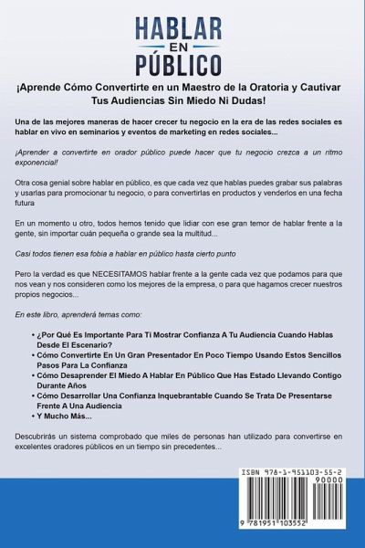 ¡Aprende Cómo Convertirte en un Maestro de la Oratoria y Cautivar Tus Audiencias Sin Miedo Ni Dudas! Una de las mejores maneras de hacer crecer tu negocio en la era de las redes sociales es hablar en vivo en seminarios y eventos de marketing en redes sociales... ¡Aprender a convertirte en orador público puede hacer que tu negocio crezca a un ritmo exponencial! Otra cosa genial sobre hablar en público, es que cada vez que hablas puedes grabar sus palabras y usarlas para promocionar tu negocio, o para convertirlas en productos y venderlos en una fecha futura En un momento u otro, todos hemos tenido que lidiar con ese gran temor de hablar frente a la gente, sin importar cuán pequeña o grande sea la multitud... Casi todos tienen esa fobia a hablar en público hasta cierto punto Algunos de nosotros hacemos todo lo posible para evitar hablar frente a personas, faltando a reuniones, diciendo que estamos enfermos, pidiéndole a alguien que haga la presentación por nosotros, etc... Pero la verdad es que NECESITAMOS hablar frente a la gente cada vez que podamos para que nos vean y nos consideren como los mejores de la empresa, o para que hagamos crecer nuestros propios negocios... En este libro, aprenderá temas como: * ¿Por Qué Es Importante Para Ti Mostrar Confianza A Tu Audiencia Cuando Hablas Desde El Escenario? * Cómo Convertirte En Un Gran Presentador En Poco Tiempo Usando Estos Sencillos Pasos Para La Confianza * Cómo Desaprender El Miedo A Hablar En Público Que Has Estado Llevando Contigo Durante Años * Cómo Desarrollar Una Confianza Inquebrantable Cuando Se Trata De Presentarse Frente A Una Audiencia * Y Mucho Más... Descubrirás un sistema comprobado que miles de personas han utilizado para convertirse en excelentes oradores públicos en un tiempo sin precedentes... Además, tendrás acceso a herramientas, trucos y secretos que los profesionales usan para mantener sus nervios controlados y su público atento... No esperes otro momento para disfrutar de esta información. ¡Obtén tu copia de Hablar en Público de inmediato!