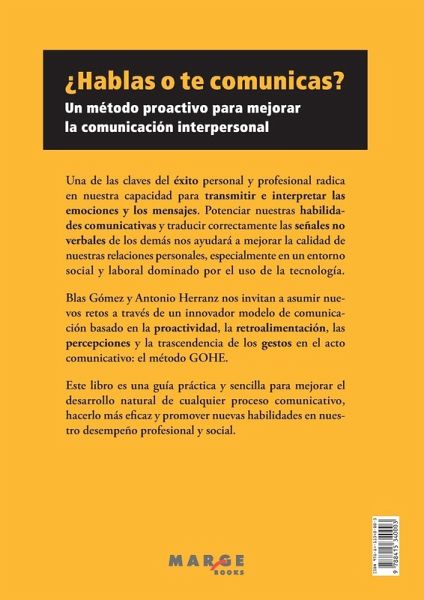 Una de las claves del éxito personal y profesional radica en nuestra capacidad para transmitir e interpretar las emociones y los mensajes. Potenciar nuestras habilidades comunicativas y traducir correctamente las señales no verbales de los demás nos ayudarán a mejorar la calidad de nuestras relaciones personales, especialmente en un entorno social y laboral dominado por el uso de la tecnología. Los autores nos invitan a asumir nuevos retos a través de un innovador modelo de comunicación basado en la proactividad, la retroalimentación, las percepciones y la trascendencia de los gestos en el acto comunicativo: el método GOHE. Este libro es una guía práctica y sencilla para mejorar el desarrollo natural de cualquier proceso comunicativo, hacerlo más eficaz y promover nuevas habilidades en nuestro desempeño profesional y social.