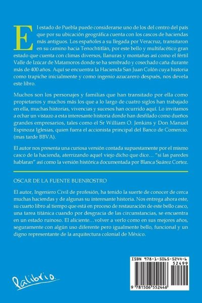 El estado de Puebla puede considerarse uno de los del centro del país que por su ubicación geográfica cuenta con los cascos de haciendas más antiguos. Los españoles a su llegada por Veracruz, transitaron en su camino hacia Tenochtitlán, por este bello y multifacético gran estado que cuenta con climas diversos, llanuras y montañas así como el fértil Valle de Izúcar de Matamoros donde se ha sembrado y cosechado caña durante más de 400 años. Aquí se encuentra la Hacienda San Juan Colón cuya historia como trapiche inicialmente y como ingenio azucarero después, nos devela este libro. Muchos son los personajes y familias que han transitado por ella como propietarios y muchos más los que a lo largo de cuatro siglos han trabajado en ella, muchas historias, vivencias y sucesos han ocurrido aquí. Lo invitamos a echar un vistazo a esta interesante historia donde han desfilado como dueños grandes empresarios, tales como el Sr William O. Jenkins y Don Manuel Espinoza Iglesias, quien fuera el accionista principal del Banco de Comercio. (mas tarde BBVA). El autor nos presenta una curiosa versión contada supuestamente por el mismo casco de la hacienda, aterrizando aquel viejo dicho que dice... "si las paredes hablaran" así como la versión histórica documentada por Blanca Suárez Cortez.