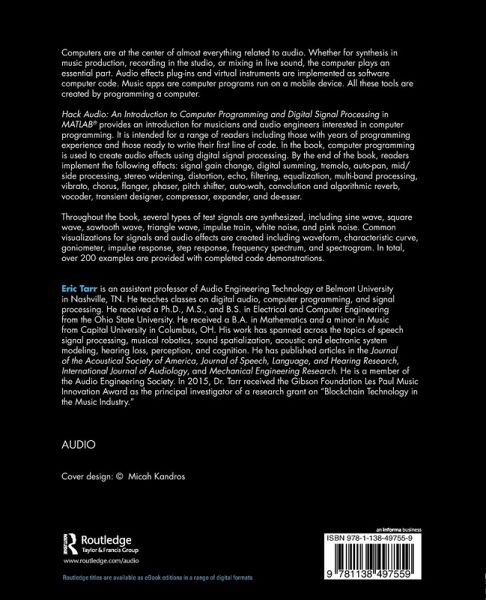 Hack Audio: An Introduction to Computer Programming and Digital Signal Processing in MATLAB provides an introduction for musicians and audio engineers interested in computer programming. It is intended for a range of readers including those with years of programming experience and those ready to write their first line of code. In the book, computer programming is used to create audio effects using digital signal processing. By the end of the book, readers implement the following effects: signal gain change, digital summing, tremolo, auto-pan, mid/side processing, stereo widening, distortion, echo, filtering, equalization, multi-band processing, vibrato, chorus, flanger, phaser, pitch shifter, auto-wah, convolution and algorithmic reverb, vocoder, transient designer, compressor, expander, and de-esser.