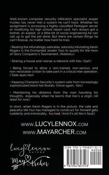 Well-known computer security infiltration specialist Jasper Huxley has never met a system he can't hack. Whether his assignment is accessing a highly-classified Pentagon server or modifying his high school report card, he's always got a botnet, an exploit, or a little bit of social engineering he can call up to get the job done. But there are certain things he can't finesse, no matter how hard he tries. ¿Beating the infuriatingly adorable, adorably infuriating Kevin Rogers in the Enchanted Javelin Toss to qualify for the Horn of Glory Conqueror's Tournament. (Robbery.) ¿Sharing a house and-worse-a network with Kev. (Gah.) ¿Being forced to allow a non-trained, non-serious, and non-resistible civilian to take part in a critical intel operation. (¿side-eyes Kev) ¿Keeping Champion Security's system safe from increasingly sophisticated black hat threats. (Once again... Kev.) ¿Maintaining his distance from the man haunting his thoughts... especially when he learns that Kev's a virgin. (At least for now.) In short, when Kevin Rogers is in the picture, the safe and peaceful life Hux has managed to construct for himself gets suddenly and irrevocably... hacked. (And it's all Kev's fault.)