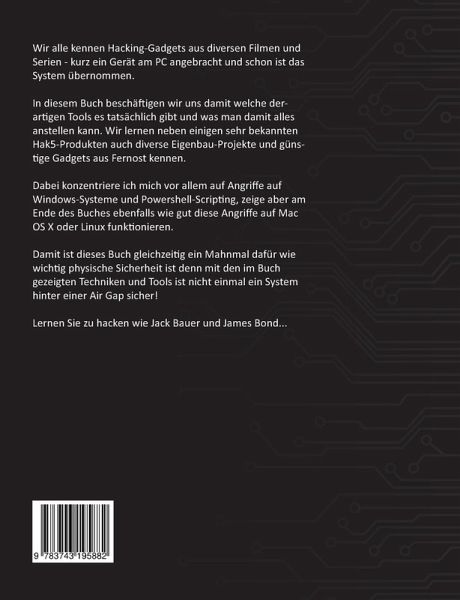 Wir alle kennen Hacking-Gadgets aus diversen Filmen und Serien - kurz ein Gerät am PC angebracht und schon ist das System übernommen. In diesem Buch beschäftigen wir uns damit welche derartigen Tools es tatsächlich gibt und was man damit alles anstellen kann. Wir lernen neben einigen sehr bekannten Hak5-Produkten auch diverse Eigenbau-Projekte und günstige Gadgets aus Fernost kennen.Dabei konzentriere ich mich vor allem auf Angriffe auf Windows-Systeme und Powershell-Scripting, zeige aber am Ende des Buches ebenfalls wie gut diese Angriffe auf Mac OS X oder Linux funktionieren.Damit ist dieses Buch gleichzeitig ein Mahnmal dafür wie wichtig physische Sicherheit ist denn mit den im Buch gezeigten Techniken und Tools ist nicht einmal ein System hinter einer Air Gap sicher!Lernen Sie zu hacken wie Jack Bauer und James Bond...