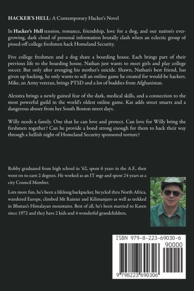 HACKER'S HELL: A Contemporary Hacker's Novel Have you ever wondered how bad information stealing will get? Have you spent hours and hours trying to prevent, then correct a credit theft? Do you believe cell phones, laptops, social media, and the cloud are wonderful inventions. Especially for petty thieves and thieving governments? In Hacker's Hell tension, romance, friendship, love for a dog, and our nation's ever-growing, dark cloud of personal information brutally clash when an eclectic group of pissed-off college freshmen hack Homeland Security. This novel is a fast-paced and realistic Hacker's Hell. Five college freshmen and a dog share a boarding house. Each brings part of their previous life to the boarding house. Nathan just wants to meet girls and play college soccer. But only after avenging his mother's suicide. Shawn, Nathan's best friend, has given up hacking, he only wants to sell an online game he created for would-be hackers. Mike, an Army veteran, brings PTSD and a lot of buddies from Afghanistan. Alexstra brings a newly gained fear of the dark, medical skills, and a connection to the most powerful guild in the world's oldest online game. Kat adds street smarts and a dangerous abuser from her South Boston street days. Willy needs a family. One that he can love and protect. Can love for Willy bring the freshmen together? Can he provide a bond strong enough for them to hack their way through a hellish night of Homeland Security sponsored torture? If you've read The Dancing Girls by M.M. Chouinard, The Fool's Run by John Sandford, or Digital Fortress by Dan Brown, then you'll enjoy Hacker's Hell by Robby Robertson. Robby's novel has the same tension loaded twists and turns plus, it includes Willy, a loveable mutt. Will the five freshmen get revenge for what happens to Willy? Enter their world and find out.