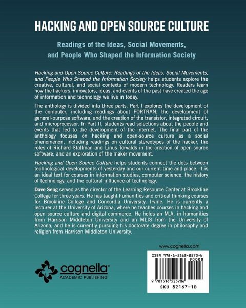 Hacking and Open Source Culture: Readings of the Ideas, Social Movements, and People Who Shaped the Information Society helps students explore the creative, cultural, and social contexts of modern technology. Readers learn how the hackers, innovators, ideas, and events of the past have created the age of information and technology we live in today. The anthology is divided into three parts. Part I explores the development of the computer, including readings about FORTRAN, the development of general-purpose software, and the creation of the transistor, integrated circuit, and microprocessor. In Part II, students read selections about the people and events that led to the development of the internet. The final part of the anthology focuses on hacking and open-source culture as a social phenomenon, including readings on cultural stereotypes of the hacker, the roles of Richard Stallman and Linus Torvalds in the creation of open source software, and an exploration of the maker movement. Hacking and Open Source Culture helps students connect the dots between technological developments of yesterday and our current time and place. It is an ideal text for courses in information studies, computer science, the history of technology, and the cultural influence of technology. Dave Seng served as the director of the Learning Resource Center at Brookline College for three years. He has taught humanities and critical thinking courses for Brookline College and Concordia University, Irvine. He is currently a lecturer at the University of Arizona, where he teaches courses in hacking and open source culture and digital commerce. He holds an M.A. in humanities from Harrison Middleton University and an MLIS from the University of Arizona, and he is currently pursuing his doctorate degree in philosophy and religion from Harrison Middleton University.