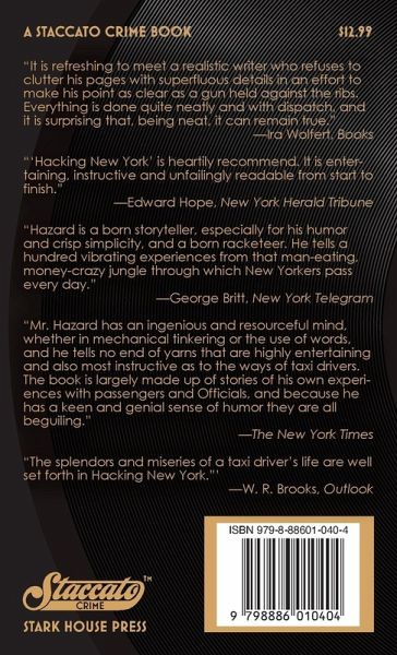 The experiences in this surprising book are drawn directly from the daily life of a New York taxicab driver in good standing. Mr. Hazard has been "hacking" the city for almost nine years. He deals with phases of life of which the average reader knows not at all-the "rackets" a taxi man has to fight, the graft he has to pay, the characters of the half-world he meets-and much more. The book compares "hacking" conditions to-day and ten years ago, when the author got his first license by shaking hands with an official and forgetting to remove a ten-dollar bill from the political palm when the handshaking was over. Every page is packed with human interest and keen understanding of character. The author came to New York to "see life in Greenwich Village." Since he had to make a living, he thought taxi driving was as good a way as any other. He is in his thirties, was a hobo and wanderer before he was a taxi driver, and is still piloting his cab through the tangles of New York traffic.-From the original 1930 dust jacket flap "Hazard is a born storyteller, especially for his humor and crisp simplicity, and a born racketeer. He tells a hundred vibrating experiences from that man-eating, money-crazy jungle through which New Yorkers pass every day."-George Britt, New York Telegram