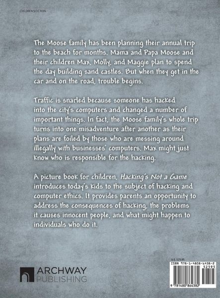 The Moose family has been planning their annual trip to the beach for months. Mama and Papa Moose and their children Max, Molly, and Maggie plan to spend the day building sand castles. But when they get in the car and on the road, trouble begins. Traffic is snarled because someone has hacked into the city's computers and changed a number of important things. In fact, the Moose family's whole trip turns into one misadventure after another as their plans are foiled by those who are messing around illegally with businesses' computers. Max might just know who is responsible for the hacking. A picture book for children, Hacking's Not a Game introduces today's kids to the subject of hacking and computer ethics. It provides parents an opportunity to address the consequences of hacking, the problems it causes innocent people, and what might happen to individuals who do it.