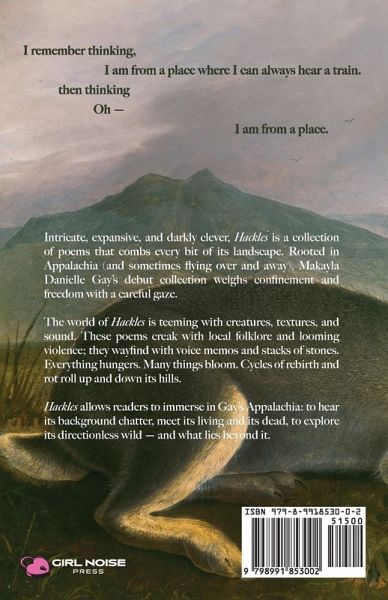 I remember thinking, I am from a place where I can always hear a train. then thinking Oh- I am from a place. Intricate, expansive, and darkly clever, Hackles is a collection of poems that combs every bit of its landscape. Rooted in Appalachia (and sometimes flying over and away), Makayla Danielle Gay's debut collection weighs confinement and freedom with a careful gaze. The world of Hackles is teeming with creatures, textures, and sound. These poems creak with local folklore and looming violence; they wayfind with voice memos and stacks of stones. Everything hungers. Many things bloom. Cycles of rebirth and rot roll up and down its hills. Hackles allows readers to immerse in Gay's Appalachia: to hear its background chatter, meet its living and its dead, to explore its directionless wild - and what lies beyond it.
