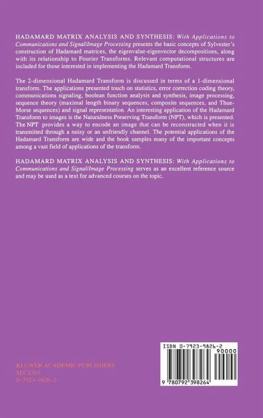 Hadamard Matrix Analysis and Synthesis: With Applications to Communications and Signal/Image Processing presents the basic concepts of Sylvester's construction of Hadamard matrices, the eigenvalue-eigenvector decompositions, along with its relationship to Fourier transforms. Relevant computational structures are included for those interested in implementing the Hadamard transform.
