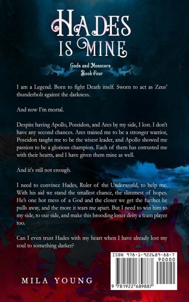 I am a Legend. Born to fight Death itself. Sworn to act as Zeus' thunderbolt against the darkness. And now I'm mortal. Despite having Apollo, Poseidon, and Ares by my side I lost. I don't have any second chances. Ares trained me to be a stronger warrior, Poseidon taught me to be the wisest leader, and Apollo showed me passion to be a glorious champion. Each of them has entrusted me with their hearts, and I have given them mine as well. And it's still not enough. I need to convince Hades, Ruler of the Underworld, to help me. With his aid we stand the smallest chance, the slimmest of hopes. He's one hot mess of a God and the closer we get the further he pulls away, and the more it tears me apart. But I need to win him to my side, to our side, and make this brooding loner deity a team player too. Can I even trust Hades with my heart, when I have already lost my soul to something darker?