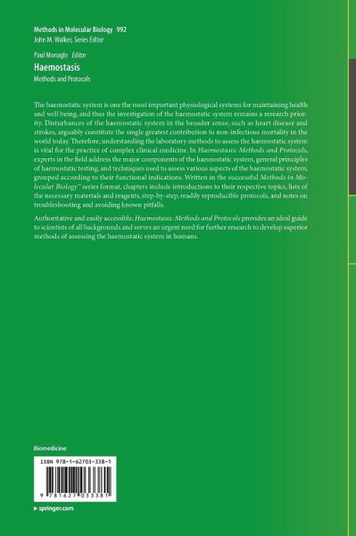 The haemostatic system is one the most important physiological systems for maintaining health and well being, and thus the investigation of the haemostatic system remains a research priority. Disturbances of the haemostatic system in the broader sense, such as heart disease and strokes, arguably constitute the single greatest contribution to non-infectious mortality in the world today. Therefore, understanding the laboratory methods to assess the haemostatic system is vital for the practice of complex clinical medicine. In Haemostasis: Methods and Protocols, experts in the field address the major components of the haemostatic system, general principles of haemostatic testing, and techniques used to assess various aspects of the haemostatic system, grouped according to their functional indications. Written in the successful Methods in Molecular Biology(TM) series format, chapters include introductions to their respective topics, lists of the necessary materials and reagents, step-by-step, readily reproducible protocols, and notes on troubleshooting and avoiding known pitfalls.