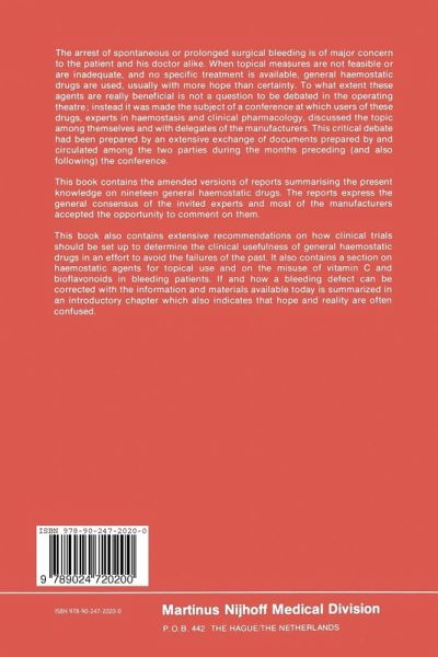 clinical efficacy of haemostatic agents had to be published work and had to fulftl most of the following minimum requirements: (1) Quantitation ofthe measured blood loss was required, and not merely a clinical impression of the amount of blood lost, if the document pertained to a planned but "open" clinical trial. (2) Only double-blind trials with random allocation of the placebo and experimental drug to preselected patients were considered suitable for discussion, if the blood loss had not been quantitated in a prospective trial. (3) Defmition and appropriate selection of patients admitted to the trial: all inclusion and exclusion criteria used to select patients had to be mentioned in detail. (4) Once included in the trial, patients could be withdrawn only on the basis of strict criteria for withdrawal which had been defined in advance. (5) A double-blind trial had to be continued for an adequate length of time if the haemostatic agent was being assessed in the prevention of bleeding in patients with a long lasting bleeding disorder . (6) A clear and detailed statistical analysis of the results was required. Moreover, a clear distinction between the therapeutic and prophylactic value of the haemostatic agent had to be made and applied separately to the group of patients without any major basic disorder and those with a bleeding disorder e.g. : chronic thrombocytopenia, haemophilia, Rendu-Osler telangiectasia ... General statements not substantiated by experimental data, even when issued by well-known authorities, were not considered a reasonable basis for discussion.