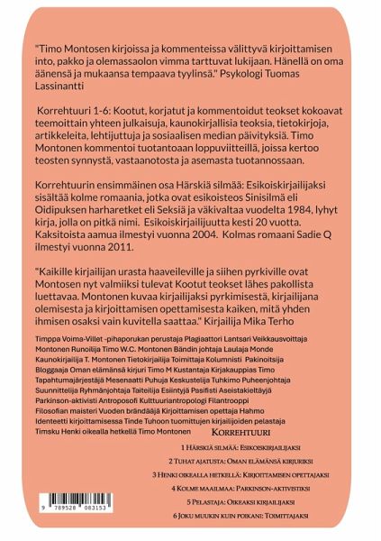 TIMO MONTONEN KORREHTUURI: KOOTUT, KORJATUT JA KOMMENTOIDUT TEOKSET 1 HÄRSKIÄ SILMÄÄ: ESIKOISKIRJAILIJAKSI 2 TUHAT AJATUSTA: OMAN ELÄMÄNSÄ KIRJURIKSI 3 HENKI OIKEALLA HETKELLÄ: KIRJOITTAMISEN OPETTAJAKSI 4 KOLME MAAILMAA: PARKINSON-AKTIVISTIKSI 5 PELASTAJA: OIKEAKSI KIRJAILIJAKSI 6 JOKU MUUKIN KUIN POIKANI: TOIMITTAJAKSI KIRJOITTAMINEN ON OLEMASSAOLOA "Timo Montosen kirjoissa ja kommenteissa välittyvä kirjoittamisen into, pakko ja olemassaolon vimma tarttuvat lukijaan. Hänellä on oma äänensä ja mukaansa tempaava tyylinsä.."Psykologi Tuomas Lassinantti Korrehtuuri 1-6: Kootut, korjatut ja kommentoidut teokset kokoavat teemoittain yhteen julkaisuja, kaunokirjallisia teoksia, tietokirjoja, artikkeleita, lehtijuttuja ja sosiaalisen median päivityksiä. Timo Montonen kommentoi tuotantoaan loppuviitteillä, joissa kertoo teosten synnystä, vastaanotosta ja asemasta tuotannossaan. Korrehtuurin ensimmäinen osa Härskiä silmää: Esikoiskirjailijaksi sisältää kolme romaania, jotka ovat esikoisteos Sinisilmä eli Oidipuksen harharetket eli Seksiä ja väkivaltaa vuodelta 1984, lyhyt kirja, jolla on pitkä nimi. Esikoiskirjailijuutta kesti 20 vuotta. Kaksitoista aamua ilmestyi vuonna 2004. Kolmas romaani Sadie Q ilmestyi vuonna 2011. Timo Montonen kirjoittaa esipuheessa: "Kolmessa ensimmäisessä romaanissani päähenkilöllä on romaanin alussa käsissään jokin kirjallinen dokumentti, paperinpala, postikortti, kirja, joka on merkityksellinen romaanin kokonaisuuden kannalta. He ovat teksteistä kiinnostuneita ihmisiä. Heille, niin kuin minulle, kirjoittaminen on olemassaoloa. Ihminen rajatun maailmansa näyttämöllä rimpuilee sisäisten yllykkeiden ja ulkoisten vaatimusten ja mahdollisuuksien ristipaineessa. Elämänsä murroskohdissa ovat paitsi kirjailija itse myös hänen luomuksensa, niin Sinisilmän Heikki, Kahdentoista aamun Ari kuin romaanin Sadie Q Maria Petäjä, Heikki Kallio, Sadie Q ja S." "Kaikille kirjailijan urasta haaveileville ja siihen pyrkiville on Montosen nyt valmiiksi tulevat Kootut teokset lähes pakollista luettavaa. Montonen kuvaa kirjailijaksi pyrkimisestä, kirjailijana olemisesta ja kirjoittamisen opettamisesta kaiken, mitä yhden ihmisen osaksi vain kuvitella saattaa." Kirjailija Mika Terho